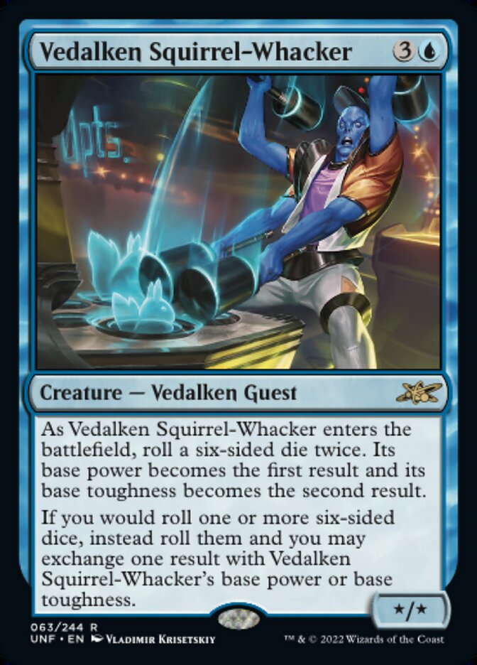 If you would roll one or more six-sided dice, instead roll them and you may exchange one result with Vedalken Squirrel-Whacker's base power or base toughness.