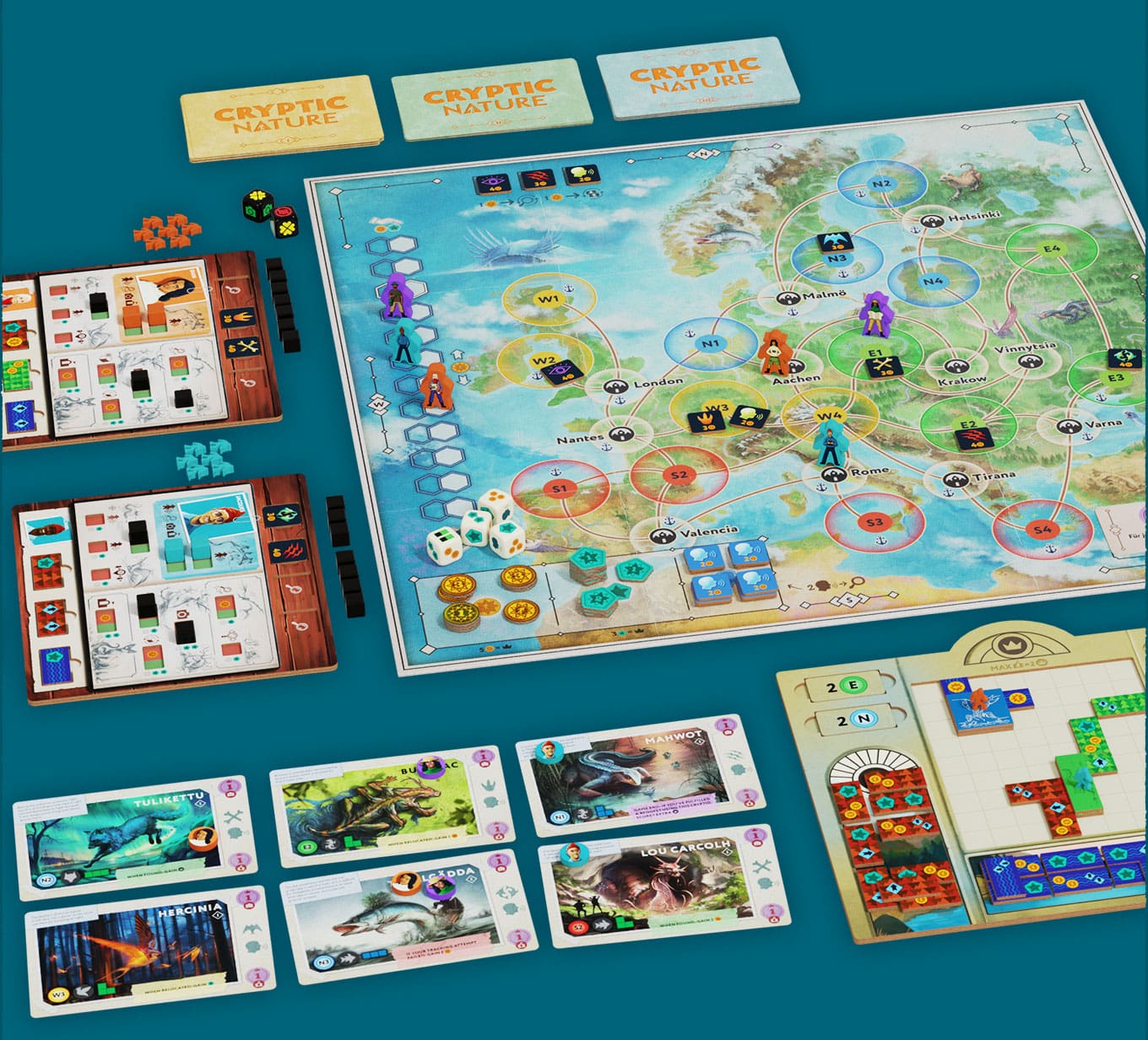 Cryptic Nature is a Euro connoisseur game for 2-4 players with a game duration of 60-90 minutes. It combines Point to Point Movement and Dice Rolling elements. The winner is the player who can track down and capture the most cryptids and present them to the public in the reserve.