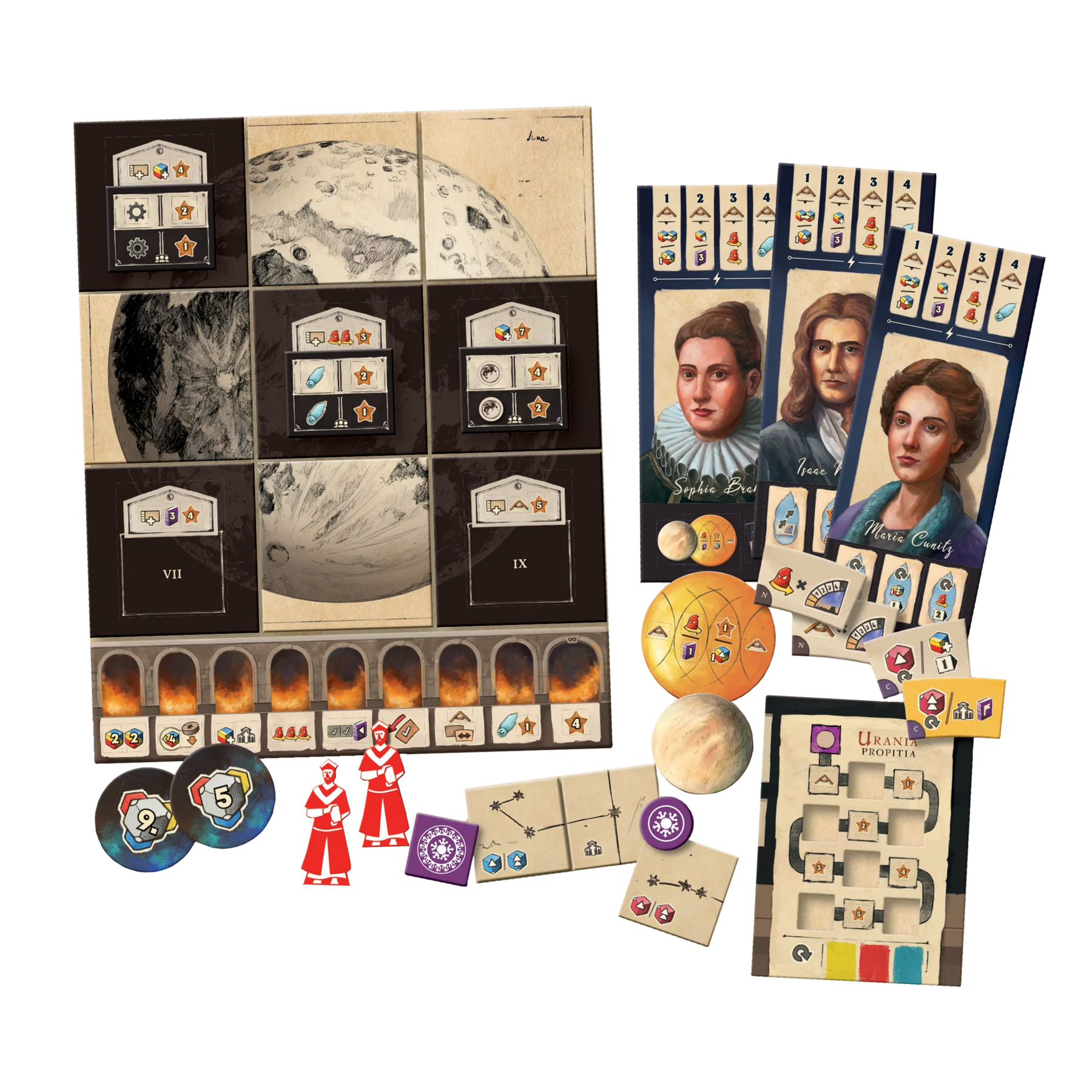 This expansion for Galileo Galilei introduces the Moon as a new object of observation, adding a new scoring mechanic to explore. Discover four new playable characters, each bringing unique abilities. Additionally, powerful inquisitors enter the game, offering great rewards to those who can successfully persuade them. Map the Moon together and enhance your strategic possibilities!